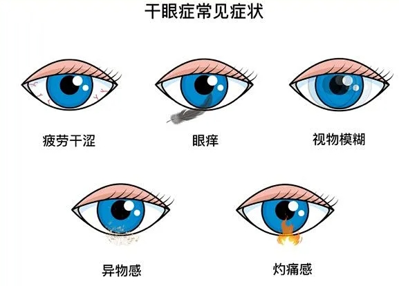 干眼的症状包括眼部干涩感、异物感、烧灼感、眼痒、疼痛、眼红、视疲劳、视物模糊、视力波动等。
