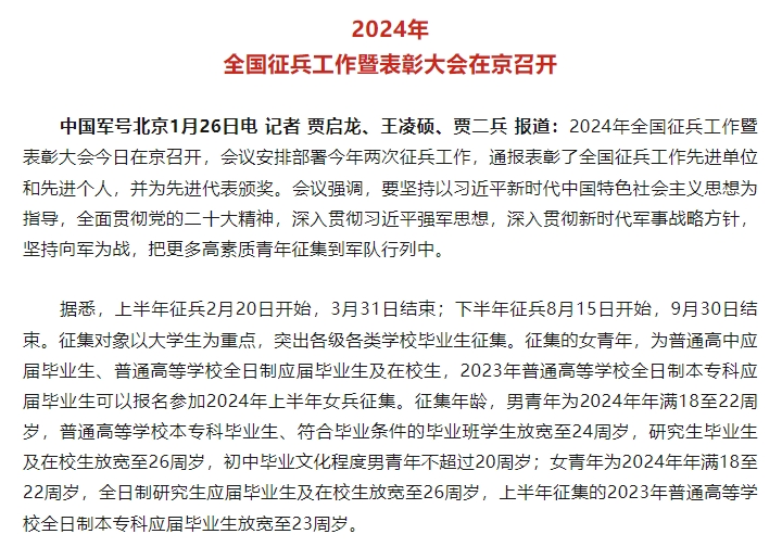在公布的信息中,上半年应征报名时间为2023年12月1日至2024年2月18日18时,下半年应征报名时间为2023年12月1日至2024年8月10日18时。