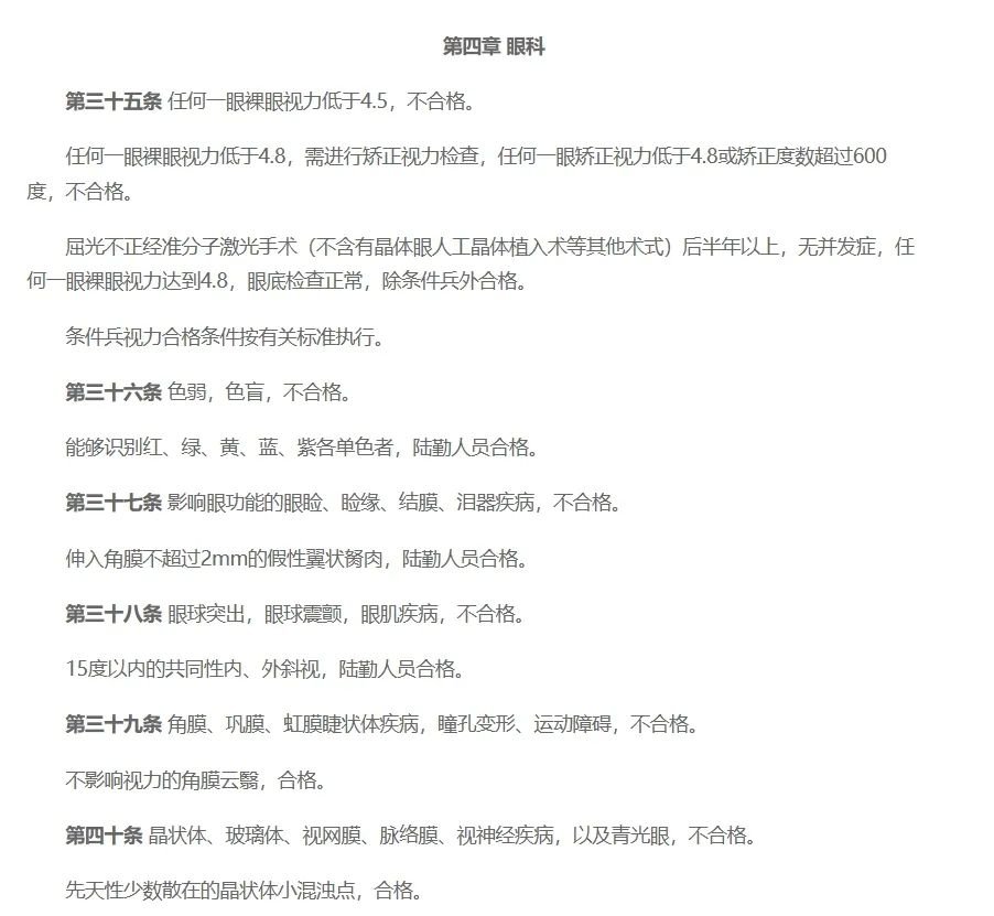 如果有考虑做近视手术,矫正视力达到体检标准的朋友们,要看清体检要求:屈光不正经准分子激光手术(不含有晶体眼人工晶体植入等其他术式)后半年以上,无并发症,任何一裸眼视力达到4.8,眼底检查正常,除条件兵外合格。